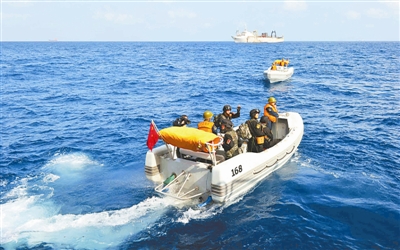 當(dāng)?shù)貢r(shí)間11日9時(shí),中國海軍第五批護(hù)航編隊(duì)“廣州”艦上,16名特戰(zhàn)隊(duì)員和2名取證人員全副武裝,分別乘直升機(jī)和小艇前往“永歡”、“孔雀松”、“龍發(fā)”和“華強(qiáng)”等4艘中國商船執(zhí)行隨船護(hù)衛(wèi)任務(wù)。本報(bào)記者作為攝像取證人員首次與4名特戰(zhàn)隊(duì)員一起,登臨中遠(yuǎn)公司所屬的散貨船“永歡”號(hào)執(zhí)行為期3天的隨船護(hù)衛(wèi)任務(wù)。