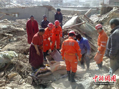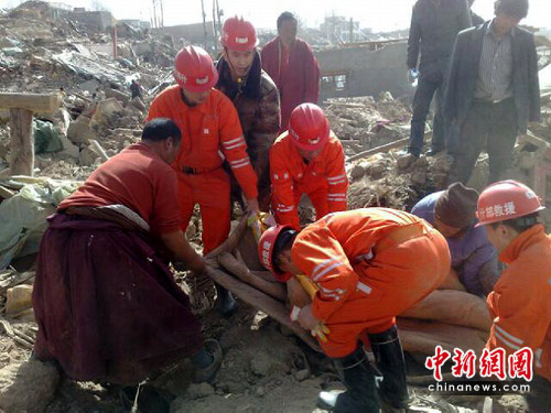 救援隊(duì)到達(dá)后玉樹(shù)縣后,首先趕到結(jié)古鎮(zhèn)“玉樹(shù)州綜合民族職業(yè)學(xué)!笨逅F(xiàn)場(chǎng),并立即展開(kāi)搜救。據(jù)了解,該職業(yè)中學(xué)的三層電教樓全部垮塌,下面還有10余名學(xué)生被埋。什邡市安全生產(chǎn)應(yīng)急救援大隊(duì)搶險(xiǎn)隊(duì)員運(yùn)用專業(yè)工具馬上進(jìn)行施救。經(jīng)過(guò)一夜緊張救援,被埋壓在職業(yè)學(xué)校電教大樓下的6名學(xué)生遺體被挖出,搜救仍在繼續(xù)。