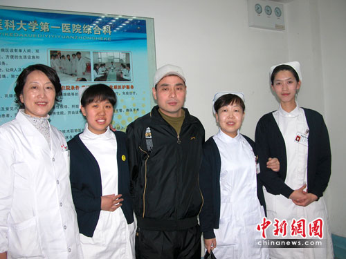 山大一院綜合科的病房里和走廊間,出院的工友們與醫(yī)護(hù)人員依依道別。