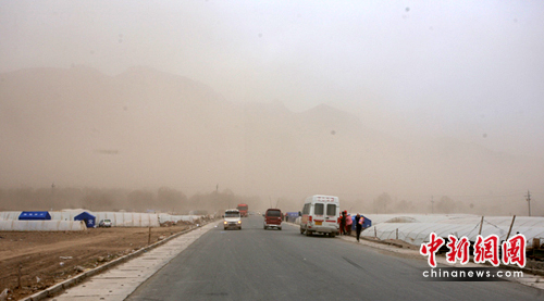 地震發(fā)生后,玉樹惡劣天氣頻頻出現(xiàn),幾乎天天都要出現(xiàn)沙塵暴。記者來到災(zāi)區(qū)后,第一感覺就是這里風(fēng)沙大,一天要刮幾次大風(fēng)。風(fēng)沙吹在的人眼睛都睜不開,災(zāi)民安置區(qū)內(nèi)天昏地暗,居住的帳篷內(nèi)床上,吃飯的碗,臉盆里,電腦上都是灰塵。