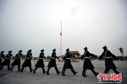 這是天安門前的國旗第二次為哀悼普通公民的生命隕落而降。兩年前的5月19日,這里也曾下半旗,向汶川大地震遇難者致哀。