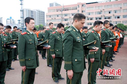 中新網(wǎng)重慶4月21日電 (連肖)21日下午14時(shí),重慶市消防總隊(duì)舉行降半旗儀式,200余名消防官兵集體為青海玉樹地震遇難同胞默哀3分鐘,向遇難者表示沉痛哀悼。