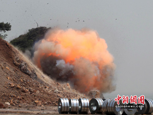 中新網(wǎng)九江4月28日電(胡國(guó)林 李濤淵)“一、二、三”,隨著一聲令下,4月27日中午,在江西九江都昌縣磯山湖附近一偏僻的時(shí)子山腳下,立即出現(xiàn)一個(gè)巨大的“火球”,原來(lái),這里正在實(shí)施銷毀日軍侵華時(shí)期遺留下來(lái)的炮彈。