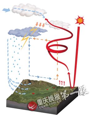 對于此次暴風(fēng),市氣象臺專家解釋,受中高緯大環(huán)流形勢的影響,5日白天,我市氣溫急升,各地高溫飆至30℃~34℃,本地不穩(wěn)定能量聚集,此時,北方冷空氣抵達四川盆地北部邊緣。5日入夜后,冷空氣繼續(xù)迅速南下,觸發(fā)了重慶不穩(wěn)定能量的強烈釋放,我市自西向東不斷有強對流云團生成,部分對流云團前部形成了很強的下沉氣流,下沉氣流到達地面就成了強烈的大風(fēng)。在另外一些地區(qū),由于不斷有對流云團生成或移過則形成強降水。
