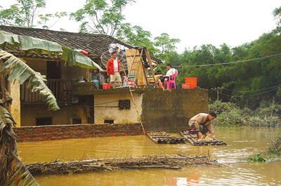 同為翁城鎮(zhèn)的富陂村由于多是土磚房,受災(zāi)更為嚴(yán)重。走進(jìn)村子,幾乎找不到幾間完整的房子,村民們忙著從斷壁殘?jiān)姓覍ぶ苡玫囊挛锖突。富陂村第七小組的村民告訴記者,該組250間房80%都已倒塌,100多村民無(wú)家可歸。前天下午,洪水來(lái)的時(shí)候,多數(shù)村民們已經(jīng)在干部們的勸說(shuō)下安全撤離,然而,仍有50名群眾被困水中。由于沒(méi)有沖鋒舟,鄉(xiāng)鎮(zhèn)干部只能找來(lái)竹子扎成竹排來(lái)回救人。水流太急,竹排不好使,干部們又找來(lái)鐵船,鐵船不聽(tīng)使喚,干部們只得趟著淹到脖子的洪水拖著鐵船搶救剩下的群眾。