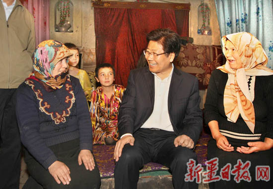 “你好啊,我從烏魯木齊來看望大家!”5月9日下午,新疆維吾爾自治區(qū)黨委上午在烏魯木齊舉行的北疆片區(qū)座談會(huì)剛一結(jié)束,自治區(qū)黨委書記張春賢立即趕往喀什,看望各族群眾,就有關(guān)民生工程建設(shè)進(jìn)行調(diào)研。一下飛機(jī),來不及休息,張春賢就驅(qū)車前往喀什市多來提巴格鄉(xiāng)14村。走進(jìn)村民玉蘇甫·艾買提的院落,張春賢便上前握住他的手說。