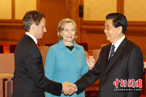 胡錦濤說,兩天來,克林頓國務(wù)卿、蓋特納財(cái)長和王岐山副總理、戴秉國國務(wù)委員一起共同主持了第二輪中美戰(zhàn)略與經(jīng)濟(jì)對話,圍繞一系列戰(zhàn)略性、全局性、長期性的問題坦誠深入地交換了意見,取得很多成果。我對此表示祝賀,并對四位特別代表的辛勤工作和高效率表示高度贊賞。