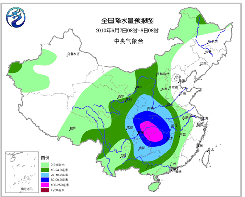 6月7日,新疆大部、西藏中部、甘肅西部、青海西部、內(nèi)蒙古大部、黑龍江大部、吉林、遼寧、河北大部、山西北部、北京、天津、山東、江蘇、上海、浙江、江西、安徽東部、福建、廣東大部為多云到晴天氣;云南西部、廣西、海南有陣性降雨;大部分地區(qū)日最高氣溫在28~33℃之間。我國(guó)其余大部分地區(qū)有小到中雨,其中甘肅中東部、陜西、四川東部、重慶、貴州大部、湖北、湖南、河南西南部等地的部分地區(qū)有大雨,部分地區(qū)有暴雨,局地有大暴雨,并伴有短時(shí)雷雨大風(fēng)(圖1),日最高氣溫一般在22~28℃之間,天氣較為涼爽。