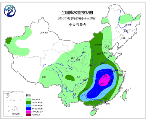 6月8日,西北地區(qū)中西部、內(nèi)蒙古西部和東部、東北大部等地為晴到多云天氣,日最高氣溫29~33℃,其中新疆盆地地區(qū)日最高氣溫可達(dá)35~37℃。我國(guó)其余大部分省(區(qū)、市)將有小到中雨,其中湖北、安徽南部、湖南、江西、浙江西部、福建西北部、廣東北部、廣西北部等地有大雨,部分地區(qū)有暴雨,湖北東南部、湖南北部、江西北部等地局地有大暴雨(圖2),并伴有短時(shí)雷雨大風(fēng)等強(qiáng)對(duì)流天氣,大部分地區(qū)日最高氣溫在24~28℃之間。