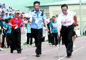 傅政華帶領(lǐng)北京市公安局領(lǐng)導(dǎo)班子,比賽跳繩,并以30秒68次的成績,名列第三名,其實就是倒數(shù)第二名。