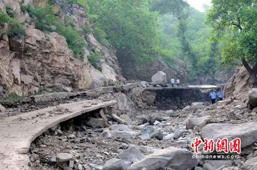據(jù)介紹,13日晚20時許,淶水縣九龍鎮(zhèn)突降百年不遇特大暴雨,并伴有大風(fēng)冰雹,頃刻間,山洪裹著巨石、泥漿呼嘯而下,席卷了九龍鎮(zhèn)沿河道的六個村莊,致使嶺南臺、莊里、莊頭、高鋪、柏林城、南莊六個村受災(zāi)嚴重。據(jù)初步估算,受災(zāi)人口3100多人、牲畜2000多頭(只),倒塌損壞房屋499間、橋梁5座、車輛31輛,毀壞道路10.7公里、耕地1312畝、樹木16925棵,另有兩人失蹤,直接經(jīng)濟損失達8197.8萬元。