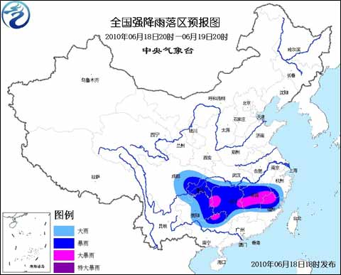 預(yù)計,6月18日20時到6月19日20時,四川盆地大部、重慶大部、貴州中東部、湖北南部、湖南大部、江西大部、浙江南部、福建中北部、廣西北部等地有大到暴雨,其中,湖南中部、江西中部、福建西北部、廣西東北部等地的部分地區(qū)有大暴雨;上述部分地區(qū)并伴有短時雷雨大風(fēng)等強對流天氣。