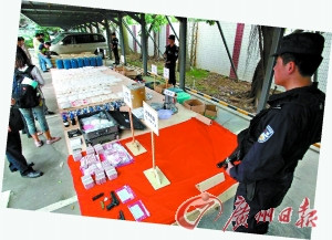 4月22日,東莞市公安局在省公安廳統(tǒng)一指揮和陜西警方的支持下,破獲“330A”特大武裝制販毒案件,抓獲潘某斌等犯罪嫌疑人15名,搗毀制毒工場1個,繳獲K粉約246千克、冰毒約8千克、麻古約33千克、制毒原料羥亞胺1025千克,查獲美式制式手槍和仿64手槍各1支、子彈31發(fā),扣押毒資人民幣250多萬元,作案車4輛。