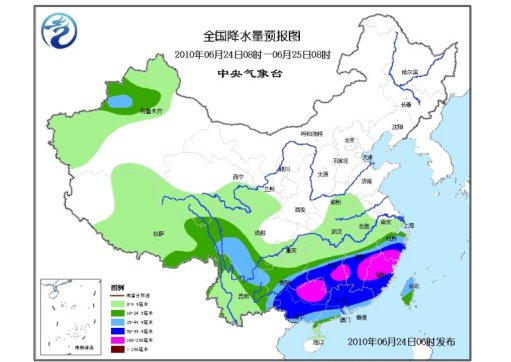 24日08時(shí)至25日08時(shí),西藏大部、青海東部和南部、川西高原等地有小到中雨(雪)或雨夾雪,新疆中西部、甘肅南部、黃淮西部、江漢大部、江淮西部、江南、華南以及西南地區(qū)大部等地有小到中雨或陣雨,其中,貴州南部、湖南中南部、江西大部、浙江中南部、福建、廣東大部、廣西等地有大到暴雨;廣西東北部、湖南東南部、江西中部偏東和中部偏西、浙江南部、福建中北部等地的部分地區(qū)有大暴雨;上述部分地區(qū)并伴有短時(shí)雷雨大風(fēng)等強(qiáng)對(duì)流天氣。另外,新疆天山西部、云南東部、川西高原南部、西藏東部等地的部分地區(qū)有大雨。新疆北部和西部有4~6級(jí)風(fēng),山口地區(qū)風(fēng)力可達(dá)8~9級(jí),新疆南疆盆地的部分地區(qū)有揚(yáng)沙或浮塵天氣;內(nèi)蒙古東部和西部有4~5級(jí)風(fēng)。東海北部海域?qū)⒂?~6級(jí)偏東風(fēng)轉(zhuǎn)6~7級(jí)、陣風(fēng)8~9級(jí)的東北風(fēng);東海南部海域、臺(tái)灣海峽、臺(tái)灣以東洋面將有西南風(fēng)5~6級(jí)增加至6~7級(jí)、陣風(fēng)8級(jí);南海北部海域、北部灣將有5~6級(jí)西南風(fēng)。