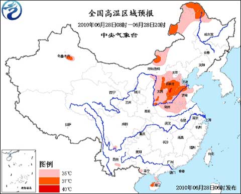 中新網(wǎng)6月28日電 中央氣象臺2010年6月28日06時繼續(xù)發(fā)布高溫藍色預警:預計,今天白天,內(nèi)蒙古東北部和中部的部分地區(qū)、黑龍江西北部、山西、河北大部、天津、河南中北部、山東中西部、安徽北部、江蘇西北部、廣東雷州半島、海南北部等地有35~37℃、局地38℃的高溫天氣,其中,河北南部的局部地區(qū)最高氣溫可達40℃。