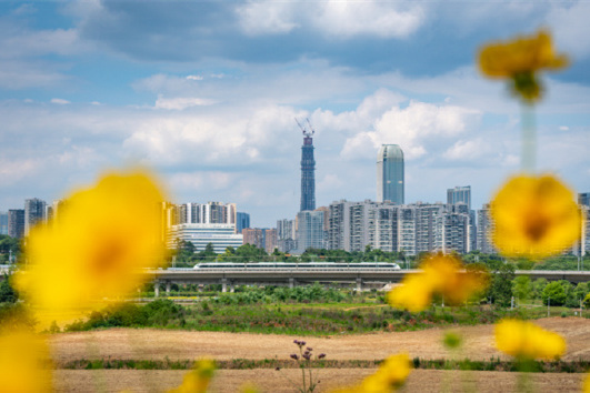 在城市的鋼鐵森林中,高鐵列車宛如一條靈動的銀蛇。它穿梭在高樓大廈之間,與城市的繁華完美相融。(投稿:潘宇)