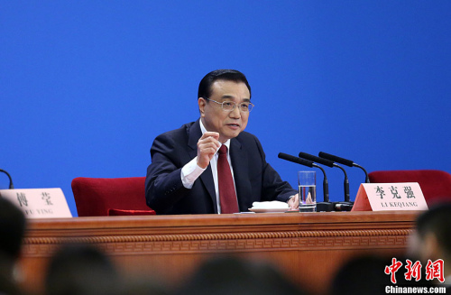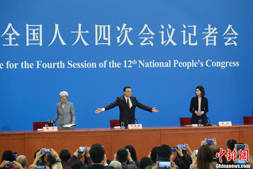 3月16日上午,國務(wù)院總理李克強在人民大會堂三樓金色大廳會見采訪十二屆全國人大四次會議的中外記者,并回答記者提出的問題。中新社記者 金碩 攝
