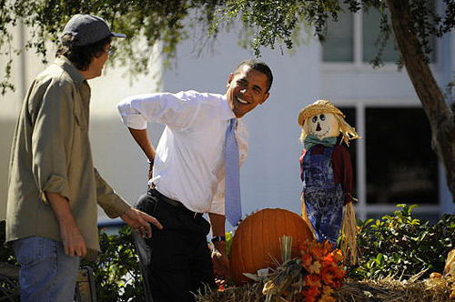 10月30日,在美國佛羅里達(dá)州的薩拉索塔,選戰(zhàn)中四處奔走的美國民主黨總統(tǒng)候選人奧巴馬忙里偷閑,來到當(dāng)?shù)氐囊患夷瞎蠄@摘南瓜,享受片刻悠閑。