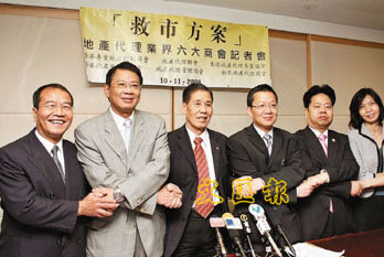 六大地產(chǎn)代理商會(香港專業(yè)地產(chǎn)顧問商會、地產(chǎn)代理聯(lián)會、香港地產(chǎn)代理專業(yè)協(xié)會、香港地產(chǎn)代理商總會、地產(chǎn)代理管理協(xié)會、新界地產(chǎn)代理商會),10日舉行記者會公布該會提出的六項(xiàng)“救市方案”。祥益地產(chǎn)總裁、香港專業(yè)地產(chǎn)顧問商會會長汪敦敬稱,近期銀行明顯收緊借貸限制,幾乎三個想買樓的買家,只有一個能夠成功取得銀行貸款,情況“很不正!薄