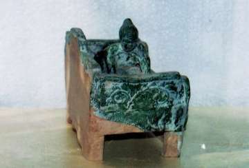 1、床:該床尺寸:長20.5cm,高:14cm,寬:12cm。從造型看漢代床的特征極為明顯。該床由三部分組成:床板,邊框,支架。該床為厚板與邊框護(hù)板相連。床面上刻有幾何形方格紋,又稱錢眼紋,泉源紋,即,古銅錢中心方孔紋飾。寓意睡臥錢眼,后輩有錢。床上邊框?yàn)樽、后、右三面高護(hù)板組成。后護(hù)板中高、兩低。每塊護(hù)板上模印草花。寓意草繁茂盛。床板與邊框護(hù)板相連放在四腿支架上。四腿支架前后又有護(hù)板。前護(hù)板上三個(gè)方格內(nèi)有卷草模印圖案,后護(hù)板無釉無紋為黃泥土胎。