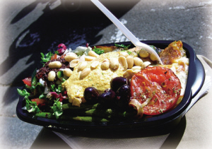 五谷雜糧和全麥谷物對健康的重要性不在話下,也是地中海地區(qū)人民常攝取的食物。希臘有風行地中海地區(qū)的PITA面包,搭備面包的沾醬更是多采多姿,當地最著名的沾醬,幾乎都是以新鮮蔬菜加上橄欖油或優(yōu)格調制而成,讓人可嘗到時蔬的鮮脆滋味。新鮮蔬果不虞匱乏的希臘,此地人民看待蔬菜、水果不僅止于配菜或盤飾,而是將其營養(yǎng)與美味發(fā)揮至極致,如蕃茄、青椒、洋蔥、茄子、小黃瓜、蔾豆、西洋芹、大蒜等,都是入菜的好材料,有了這些鮮活佐料,更讓希臘美食增色不少!此外,以油、醋腌漬的各式蔬菜、橄欖,希臘人稱之為MEZEDES,則是小酒館里常見的下酒菜。得天獨厚的希臘三面環(huán)海,擁抱海洋的恩惠─海鮮并不難,豐富的新鮮漁獲如魚、蝦、蟹、干貝、蛤蜊等,可輕易變化餐桌上的菜色。另外,隨處可見的干果零嘴攤販,擺滿花生、杏仁果、開心果、無花果、葡萄干等干果,最能展現(xiàn)希臘的街頭風情。