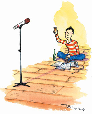 我深呼吸了一下,故作鎮(zhèn)定出場(chǎng),還不時(shí)面露快要僵掉了的微笑,以顯出大將之風(fēng)。使出一百二十分的濃情,努力回想電影《藍(lán)宇》中的感人情節(jié),賣(mài)力演唱《你怎么舍得我難過(guò)》。曾看過(guò)歌星蔡依林或周杰倫在演唱會(huì)時(shí),神色自若走來(lái)走去,與臺(tái)下觀眾互動(dòng)。我自以為對(duì)歌詞已了如指掌,越唱越來(lái)勁,便也依樣畫(huà)葫蘆離開(kāi)有歌詞的小熒光幕,邊走邊唱學(xué)大歌星模樣,顧盼生姿。