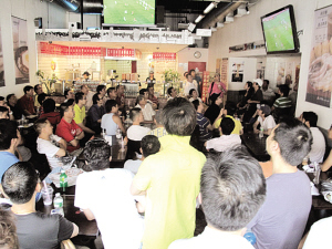 在南非世界杯舉辦期間,紐約華埠和小意大利區(qū)均沾著世界杯的喜氣,不少餐館、酒吧都在比賽時播放賽事,門外還有黑板寫上比賽兩隊介紹。“香港站”快餐店是華埠餐飲業(yè)首先這樣做的,餐館內(nèi)張貼了告示:“最低消費4.25元,開賽前30分鐘至散場!鼻蛎远颊f值,因此每場賽事均座無虛席。11日荷蘭與西班牙爭桂冠,更加吸引球迷及準球迷,餐廳內(nèi)爆滿,有的站在門外隔著玻璃看賽事,也感到過癮。