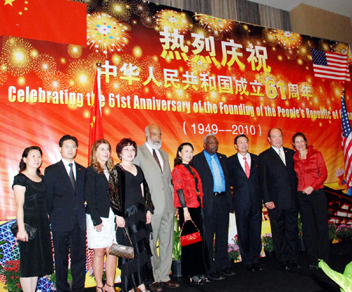楊國強在致辭中回顧了中國建國61年來取得的重大成就。他說,中國保持持續(xù)、健康、快速發(fā)展的良好勢頭,經(jīng)濟(jì)社會各項事業(yè)穩(wěn)步推進(jìn),綜合國力不斷增強,國際地位日益提高。中美互利合作的友好關(guān)系為美國中西部和中國提供了巨大的機會。到去年底,有70個中國公司來到美國中西部開展業(yè)務(wù),投入近三億美元。在中西部,大約有三萬名學(xué)生現(xiàn)在學(xué)習(xí)中文,這里已經(jīng)建立了15所孔子學(xué)院供人們學(xué)習(xí)中國文化和語言。