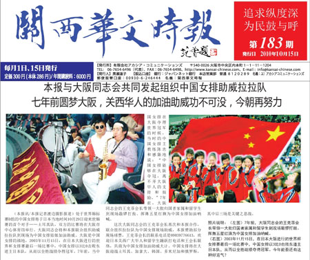 大阪是中國女排的福地,2003年11月15日,在日本大阪進(jìn)行的世界杯女排賽最后一場比賽中,中國女排以3比0擊敗東道主日本隊(duì),從而以全勝戰(zhàn)績奪得冠軍。7年前,當(dāng)中國女排在大阪奪得世界冠軍的時(shí)候,當(dāng)時(shí)的中國女排主教練陳忠和感激地說:“中國女排能夠在大阪奪冠,離不開大阪華人的支持和鼓勵(lì)。”7年前,大阪同志會的王克菲會長帶領(lǐng)一大批華僑華人和留學(xué)生到現(xiàn)場敲鑼打鼓、揮舞五星紅旗為中國女排加油吶喊。