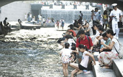 王某一家人從免稅店出來走向清溪川。清溪川是在中國也很有名的旅游景點。雖然是晚間時分,但天氣依然炎熱。王某的兩個兒子跳入水中。稍后而來的其他游客也脫掉鞋子進入水中。一位游客說:“很涼快,很舒服。孩子們也很喜歡。在城市中心建設小溪,感到很羨慕。”