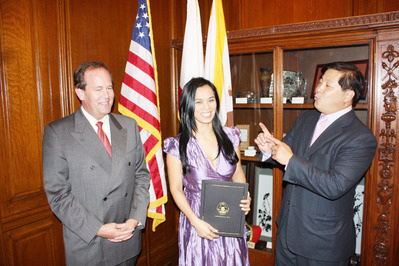 21日在市長辦公室國際廳代表舊金山接待韋唯的是市長辦公室國際貿(mào)易主任錢德勒 (Mark Chandler) 和灣區(qū)捷運董事方以偉。錢德勒表示,舊金山市府沒有頒發(fā)“榮譽市民”的慣例。市長紐森簽署的榮譽狀 (Certificate of Honor)就是對來訪者致敬的方式。紐森在榮譽狀上贊揚韋唯對美中兩國友好關(guān)系的貢獻,并對她來舊金山參加“同一首歌”表示榮幸。