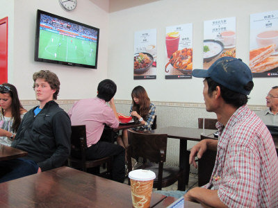 不少球迷早已準(zhǔn)備好享受這場(chǎng)足球盛宴,據(jù)美國(guó)《星島日?qǐng)?bào)》報(bào)道,紐約下東城不少酒吧、餐廳甚至小區(qū)團(tuán)體早已準(zhǔn)備了看球場(chǎng)地,以吸引顧客。華埠地威臣街“香港站”快餐店門外的大餐牌早早的就換成世界杯賽事的中英文海報(bào)和賽程細(xì)表,店內(nèi)兩部寬屏的液晶電視,輪流播著不同體育節(jié)目。