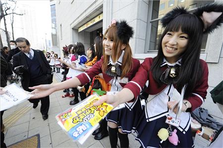 據(jù)報道,“女仆們”聚集在以“御宅街”聞名的大阪日本橋上,這樣做的目的是要鼓勵因經(jīng)濟不景氣而易陷入消沉的上班族。來來往往的行人看到這番不同于往常的景象都感到吃驚,但也有人面露羞澀的微笑或是拿出照相機留念。