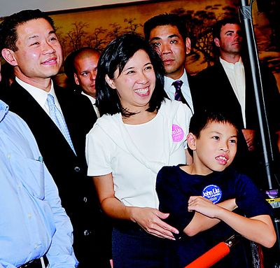 盡管票數(shù)未達(dá)40%的法定下線,劉醇逸支持者的心情絲毫不受影響,隨著各地傳來的捷報,支持者們的心情也跟著激昂。晚間10時45分,劉醇逸牽著妻子李迪儀、八歲兒子劉正龍一出現(xiàn)在會場,現(xiàn)場“John Liu!”呼聲不斷,將整場情緒帶到最高點。