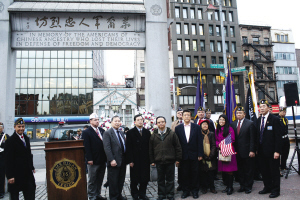 下午,紐約華裔美國退伍軍人會在華埠華裔軍人忠烈坊舉行另一個紀(jì)念儀式--向華裔軍人獻(xiàn)上花圈,呼吁人們勿忘華裔軍人對美國作出的貢獻(xiàn)。