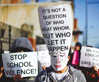 南費城高中亞裔學生、家長和華埠小區(qū)領袖百余人,9日下午手持“是誰讓它發(fā)生”等抗議標語,游行至教育局參加公聽會,游行者高喊“停止學校暴力”、“給我安全教育環(huán)境”,抒發(fā)壓抑多時的不滿。