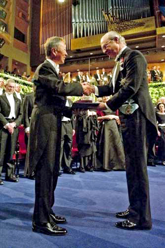 頒獎(jiǎng)當(dāng)天共有8人上臺(tái)領(lǐng)獎(jiǎng),高錕被安排在第一個(gè)。瑞典國王卡爾十六世—古斯塔夫破格走向高錕站立處為他頒獎(jiǎng),彼此親切握手致意。高錕從容自若,滿臉笑容從瑞典國王手中接過諾貝爾物理獎(jiǎng)狀,場(chǎng)面相當(dāng)溫馨。