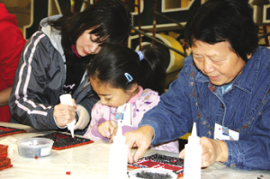 副會(huì)長鹿強(qiáng)當(dāng)天全家上陣,包括岳父岳母和妻子兒女在內(nèi)的一家六口全都來到了粘花現(xiàn)場,一起為世博會(huì)花車中國館模型粘貼由紅豆和黑豆組成的吉祥圖案,岳父方先生一邊干活一邊表示,能為世博會(huì)花車出一份力,這是他們?nèi)业淖院馈?/p>