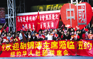 9月21日,中國(guó)國(guó)家主席胡錦濤抵達(dá)紐約出席聯(lián)合國(guó)峰會(huì),美國(guó)東部地區(qū)3000華人華僑聚集在紐約曼哈頓華爾道夫酒店附近,熱烈歡迎。歡迎人群來(lái)自紐約、新州、賓州、康州等地,大紐約地區(qū)各大高校也組織了上千留學(xué)生前往歡迎。現(xiàn)場(chǎng)有鮮艷的國(guó)旗及醒目多樣的歡迎標(biāo)語(yǔ),歌聲雷動(dòng)、歡呼聲不斷。《愛(ài)我中華》、《大中國(guó)》、《歌唱祖國(guó)》等歌曲回蕩在曼哈頓上空。不少歡迎者更是興奮地跳起了舞,歡迎遠(yuǎn)方的貴客。歡迎人群中年齡最小只有10個(gè)月大,最大的已經(jīng)80多歲。中國(guó)駐美大使周文重代表胡錦濤向歡迎隊(duì)伍,以及美國(guó)的所有華人表示感謝。
