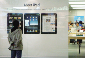 自從上周六iPad開始上市以來,洛杉磯各地蘋果店熱銷這款蘋果家族最新產(chǎn)品,有的店甚至出現(xiàn)了連夜大排長龍的壯觀景象。本周一許多蘋果電中的顧客仍然川流不息,許多都是慕名而來想一睹iPad的風(fēng)采。