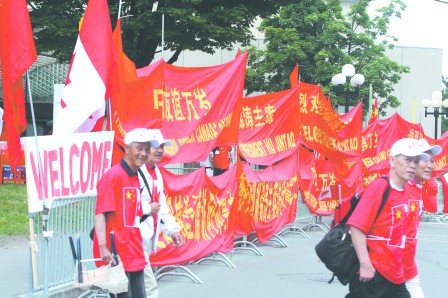 除了渥太華本地的華人團(tuán)體和學(xué)生外,多倫多大學(xué)中國學(xué)生學(xué)者聯(lián)誼會(UTCSSA),多倫多中國大學(xué)生聯(lián)合會(CUAUT)以及多倫多地區(qū)國家公派學(xué)生訪問學(xué)者聯(lián)誼會等多個大多地區(qū)的學(xué)生團(tuán)體也組織了歡迎團(tuán),專程趕赴渥太華胡錦濤下榻的酒店舉行盛大的歡迎儀式。他們手持自備中國國旗和橫幅,在酒店前沿路排成一條秩序井然的歡迎隊伍。