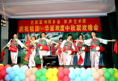 中新網(wǎng)9月21日電 據(jù)巴西南美僑報(bào)/巴西僑網(wǎng)報(bào)道,巴西溫州同鄉(xiāng)會(huì)與華聲藝術(shù)團(tuán)慶祝祖國60華誕歡度中秋節(jié)聯(lián)歡晚會(huì)19日晚在溫州同鄉(xiāng)會(huì)會(huì)館舉行,中國駐圣保羅總領(lǐng)事孫榮茂夫婦以與數(shù)百僑胞歡聚一堂,度過一個(gè)熱烈歡欣的夜晚。