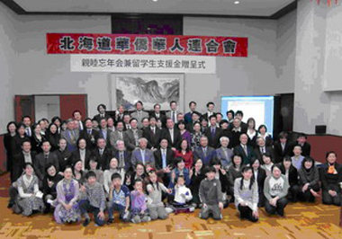 北海道華人華僑聯(lián)合會舉辦忘年會,并舉行留學(xué)生獎學(xué)金頒發(fā)儀式。會后,大家合影留念。(日本新華僑報網(wǎng)圖片)