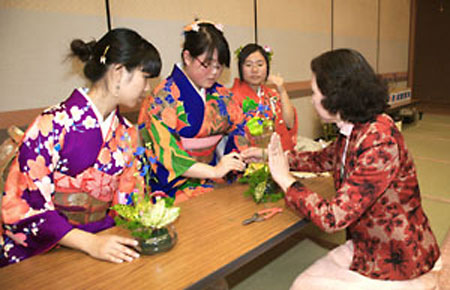 這一天,山形大學(xué)的10名中國(guó)女留學(xué)生與來(lái)自山形縣的20位致力于日中友好事業(yè)的朋友們一起交流。中國(guó)女留學(xué)生們穿上鮮艷的和服,在日本朋友的指導(dǎo)下用心體驗(yàn)插花與茶道文化的奧妙。