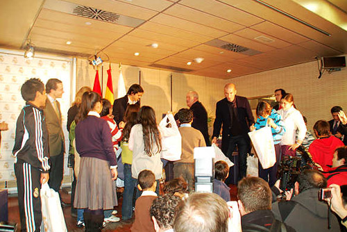 中新網(wǎng)12月26日電 據(jù)西班牙《歐華報(bào)》報(bào)道,由皇馬基金會(huì)發(fā)起“每個(gè)孩子都有玩具”的活動(dòng),日前在馬德里伯納烏球場(chǎng)內(nèi)舉行;蜀R現(xiàn)役超級(jí)球星卡卡,及退役球星齊達(dá)內(nèi)到場(chǎng)給馬德里兒童代表送出“第一份”圣誕節(jié)禮物。毛尚雅等4名華裔小朋友作為馬德里華僑子女代表,參觀了皇馬博物館、伯納烏球場(chǎng)及球員休息室等地,并在活動(dòng)中上臺(tái)領(lǐng)取禮物,接受電視臺(tái)采訪。