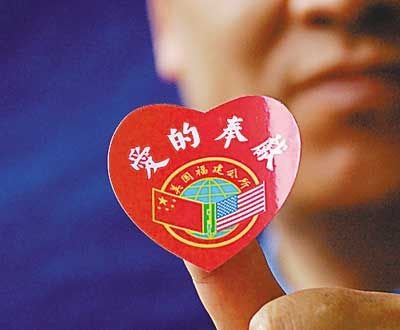 福建公所主席鄭時甘在東百老匯的募捐攤位上向每位捐款的民眾贈送一張印有“愛的奉獻”字樣和福建公所標志的紅色心型貼紙,一方面表示對捐款者的感謝,一方面希望僑胞能將貼紙傳遞給更多華人,使更多民眾為青海災(zāi)區(qū)獻上愛心。