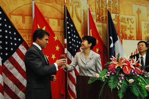 中新網(wǎng)4月28日電 據(jù)美國《美中信使報》報道,中國駐休斯頓總領(lǐng)事高燕平與美國德克薩斯州州長里克.佩里于當(dāng)?shù)貢r間27日下午5時在總領(lǐng)館會議大廳舉辦“慶祝上海世博會和中國-得州友好關(guān)系”招待會。擔(dān)任上海世博會形象大使的中國著名籃球明星姚明和他的妻子葉莉以及當(dāng)?shù)厝A人僑領(lǐng)及學(xué)界代表200余人應(yīng)邀出席招待會。