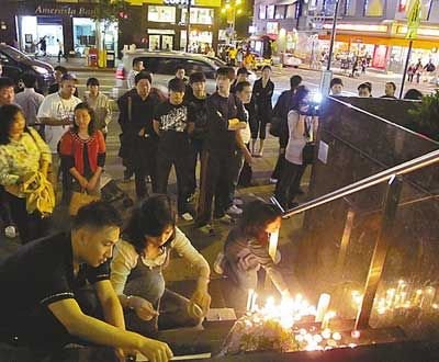 網(wǎng)友們?cè)趫D書館前的臺(tái)階前擺上大大小小的蠟燭,還有人從網(wǎng)站上下載了姚姓女留學(xué)生的照片,放在旁邊,并打印了一些悼念的話貼在圖書館門前,對(duì)她的離去表示悲痛,希望小區(qū)可以提高警惕,嚴(yán)防罪犯,同時(shí)人與人之間能互相關(guān)愛,不要對(duì)受害者“視若無睹”。