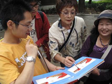 日本友人盛贊新中國(guó)60年取得的光輝成就,高度評(píng)價(jià)國(guó)慶慶典辦得精彩。漢語(yǔ)角參加者還激動(dòng)地把段躍中帶回來(lái)的各種國(guó)慶紀(jì)念品掛到身上拍照留念。