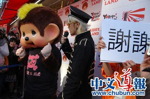 1月30日下午2時(shí),身穿旗袍的主持人小田小姐宣布“Yokoso! Japan year2001年冬季宣傳活動(dòng)”開(kāi)始,接著由MAY等“空氣吉他日本”的成員做精彩表演,最后蒙奇奇出場(chǎng),蒙奇奇的后面有人舉著用中文寫(xiě)成的展示它的身體語(yǔ)言所表現(xiàn)的意思的牌子,場(chǎng)上氣氛十分熱烈。(張石)